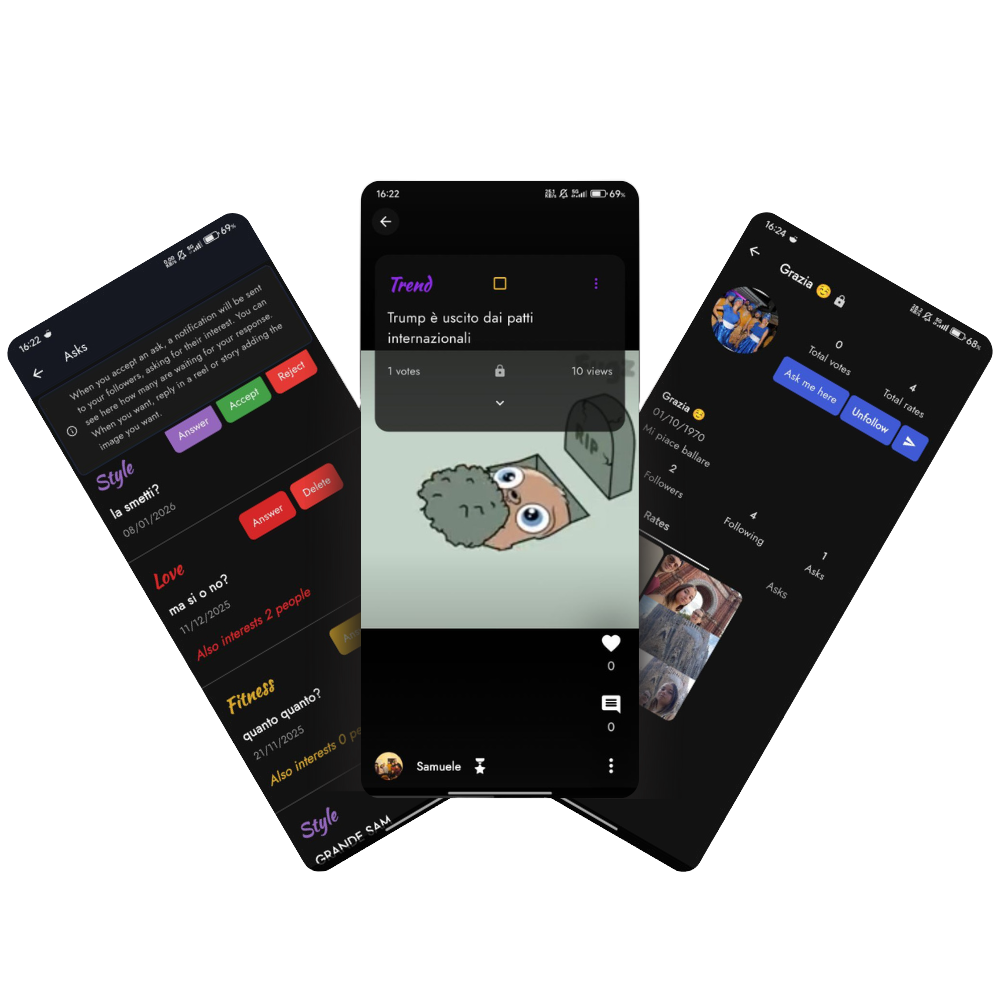 Migliaia di screenshot reali dai sondaggi e dalle storie — le persone stanno già usando Rate per chiedere, votare e divertirsi insieme.