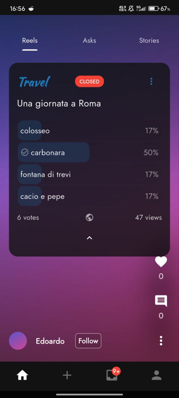 Scegli tra Pubblico, Privato o Nascosto per i tuoi sondaggi. Aggiungi foto o video, condividili nei reel e storie, e guarda i follower votare, mettere like e commentare in tempo reale per scoprire opinioni autentiche.
